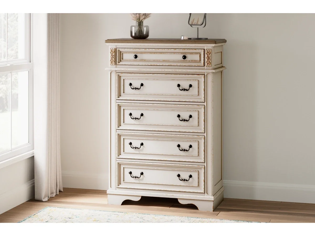 Elevating the art of traditional cottage styling, the Realyn is your dream bedroom retreat realized. A curvaceous beauty, this brilliant upholstered bed wows with dramatic scalloped details and fanciful trim work. The distressed chipped white finish charms with its heirloom appeal. Deep tufting on the cushioned upholstered headboard adds such a cozy element sure to put you at ease. Mattress and foundation/box spring available, sold separately.