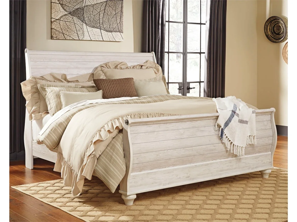 The Willowton Collection offers a breezy coastal vibe with a touch of rustic charm. Featuring a whitewashed finish accented by a driftwood-style top, this bedroom group is perfect for creating a relaxed, beach-inspired retreat. Clean lines, plank-style detailing, and antique brass-tone hardware give it a timeless yet casual feel. A favorite for cottage, coastal, and farmhouse-style spaces.